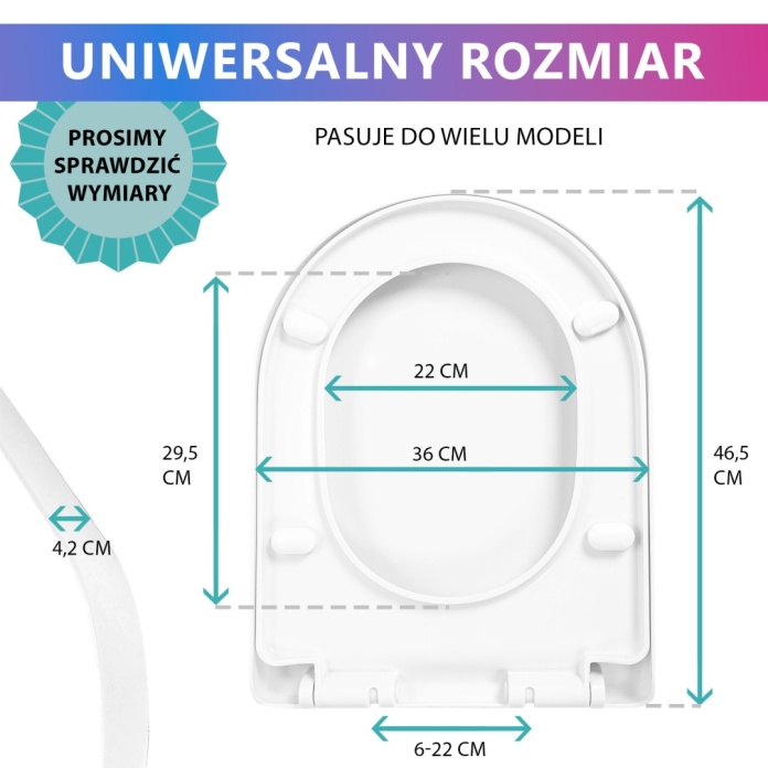 - Uniwersalny rozmiar – kompatybilność z większością standardowych misek toaletowych.