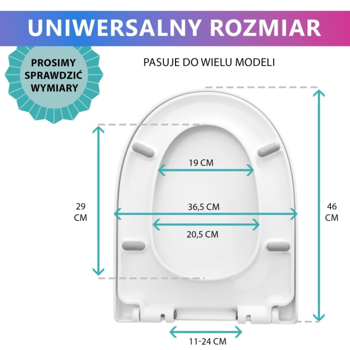 - Uniwersalne dopasowanie – pasuje do większości standardowych misek WC (rozstaw śrub 7-18 cm).