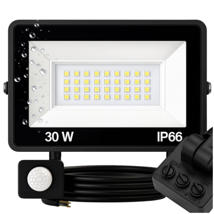 Halogen Naświetlacz LED 30W z Czujnikiem Ruchu i Zmierzchu na Kablu Naświetlacz Zewnętrzny IP65 do Ogrodu i Elewacji ASATO®