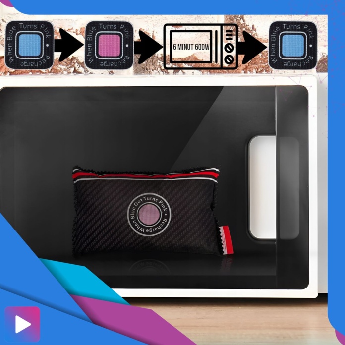 Specjalny wskaźnik koloru poinformuje Cię, kiedy pochłaniacz wymaga regeneracji. Gdy zmieni kolor z niebieskiego na różowy, wystarczy umieścić go w mikrofalówce na 6 minut. Po tym czasie pochłaniacz jest ponownie gotowy do pracy.